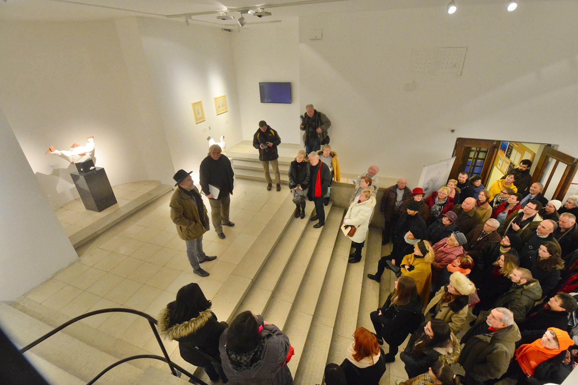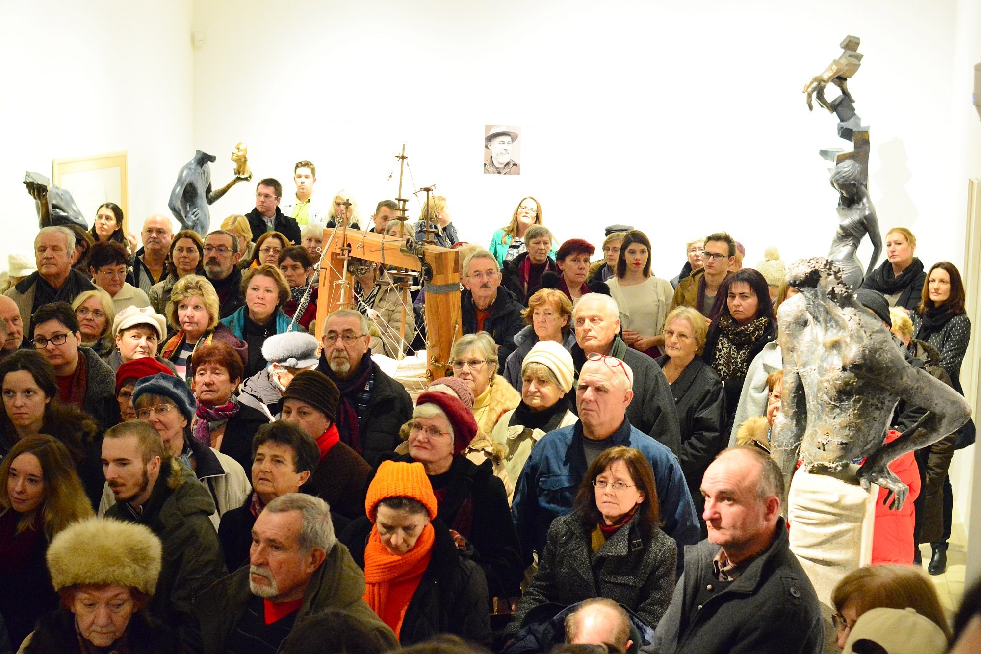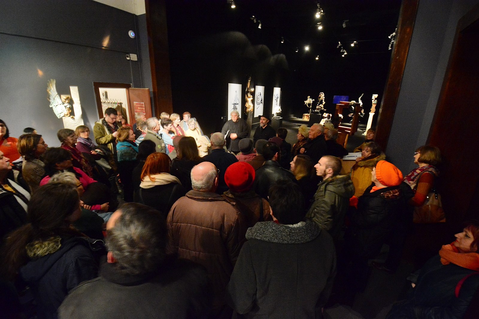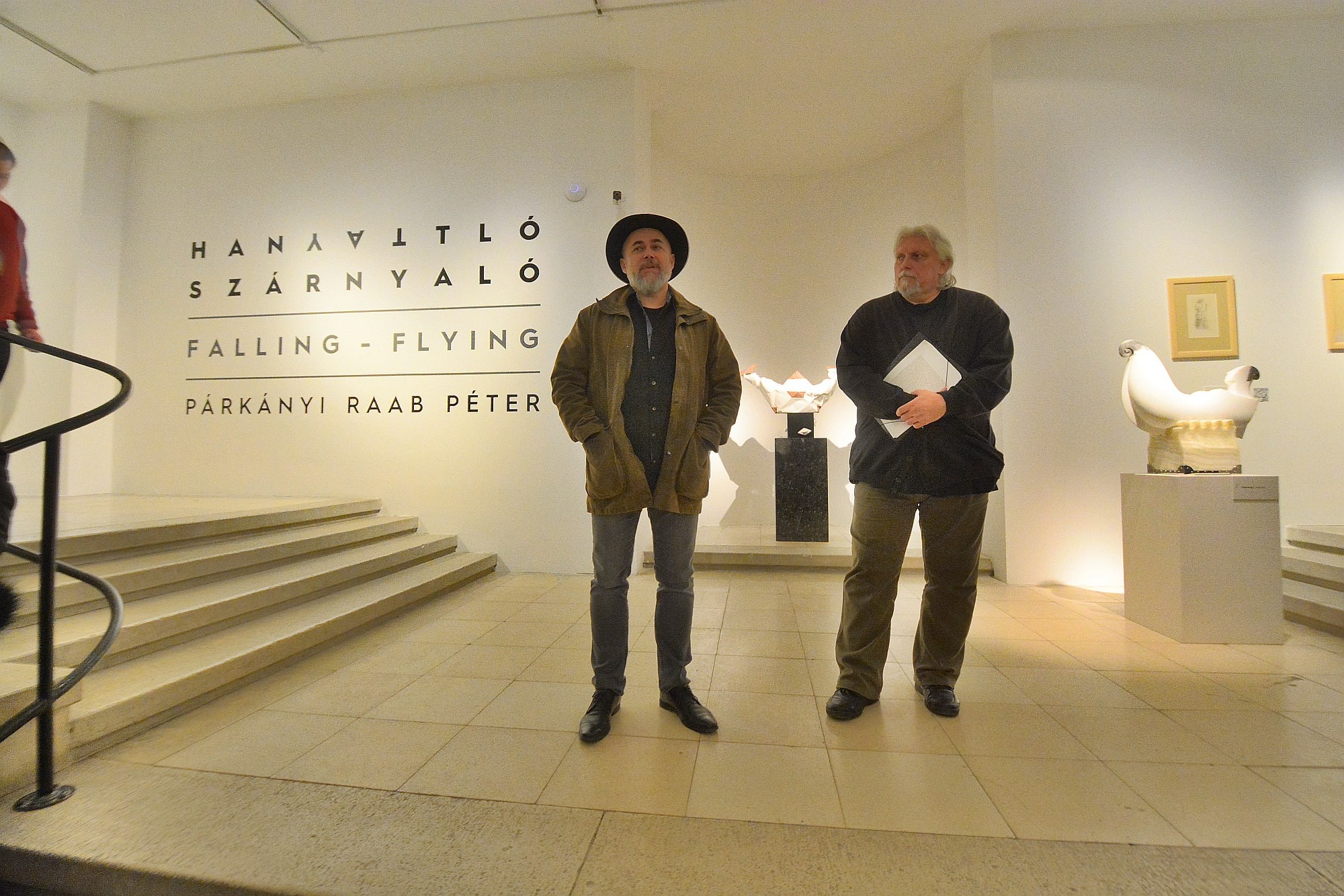 Egy gombostűt sem lehetett volna leejteni, annyian voltak a Csók István Képtárban a HANYATtLÓ - SZÁRNYALÓ című kiállítás tárlatvezetésén, melyet a szobrászművész, Párkányi Raab Péter és Filep Sándor, festőművész tartott közösen.