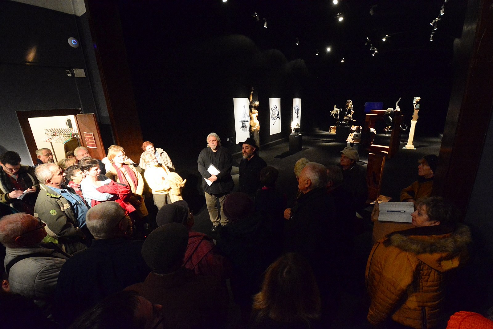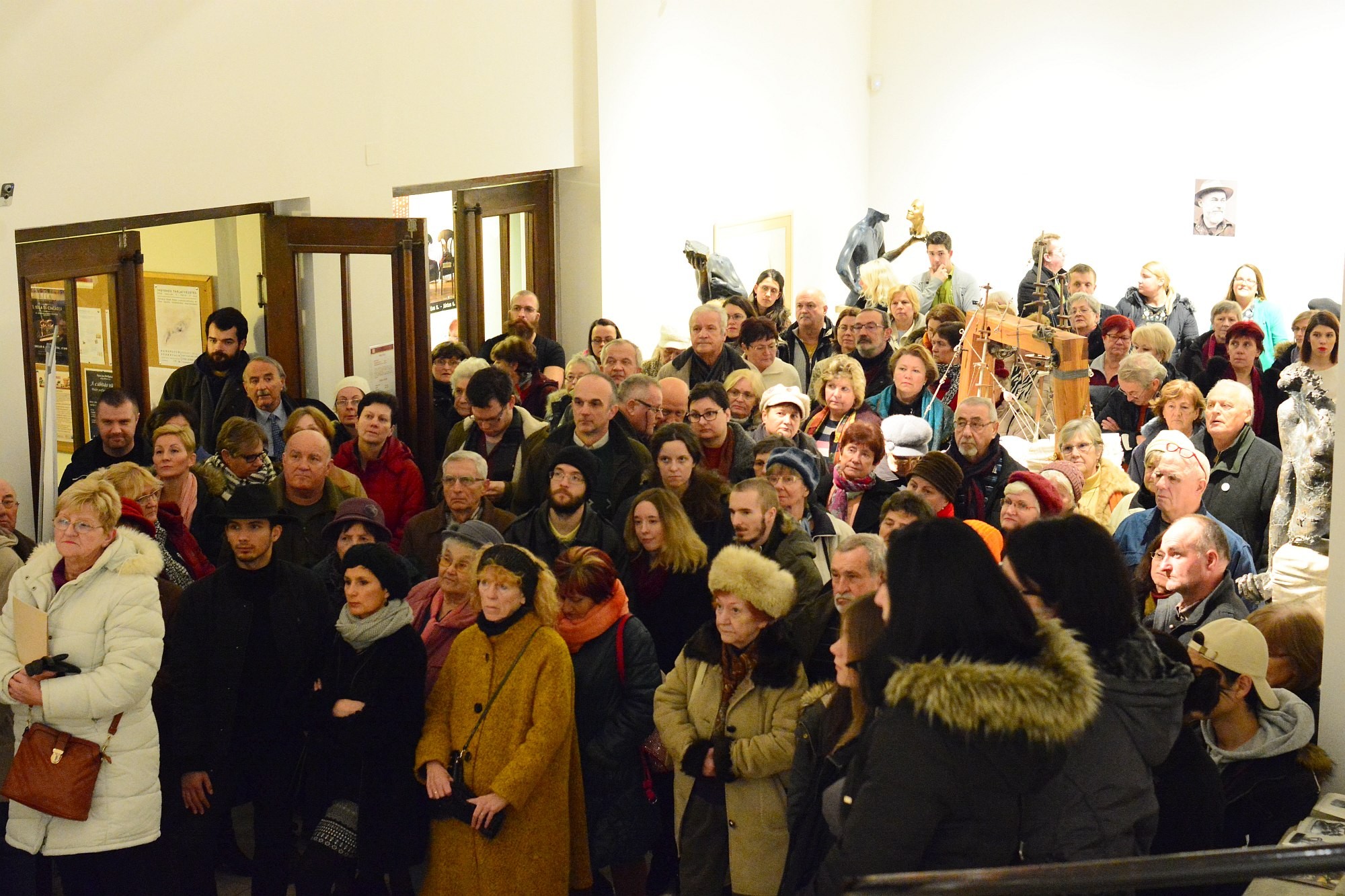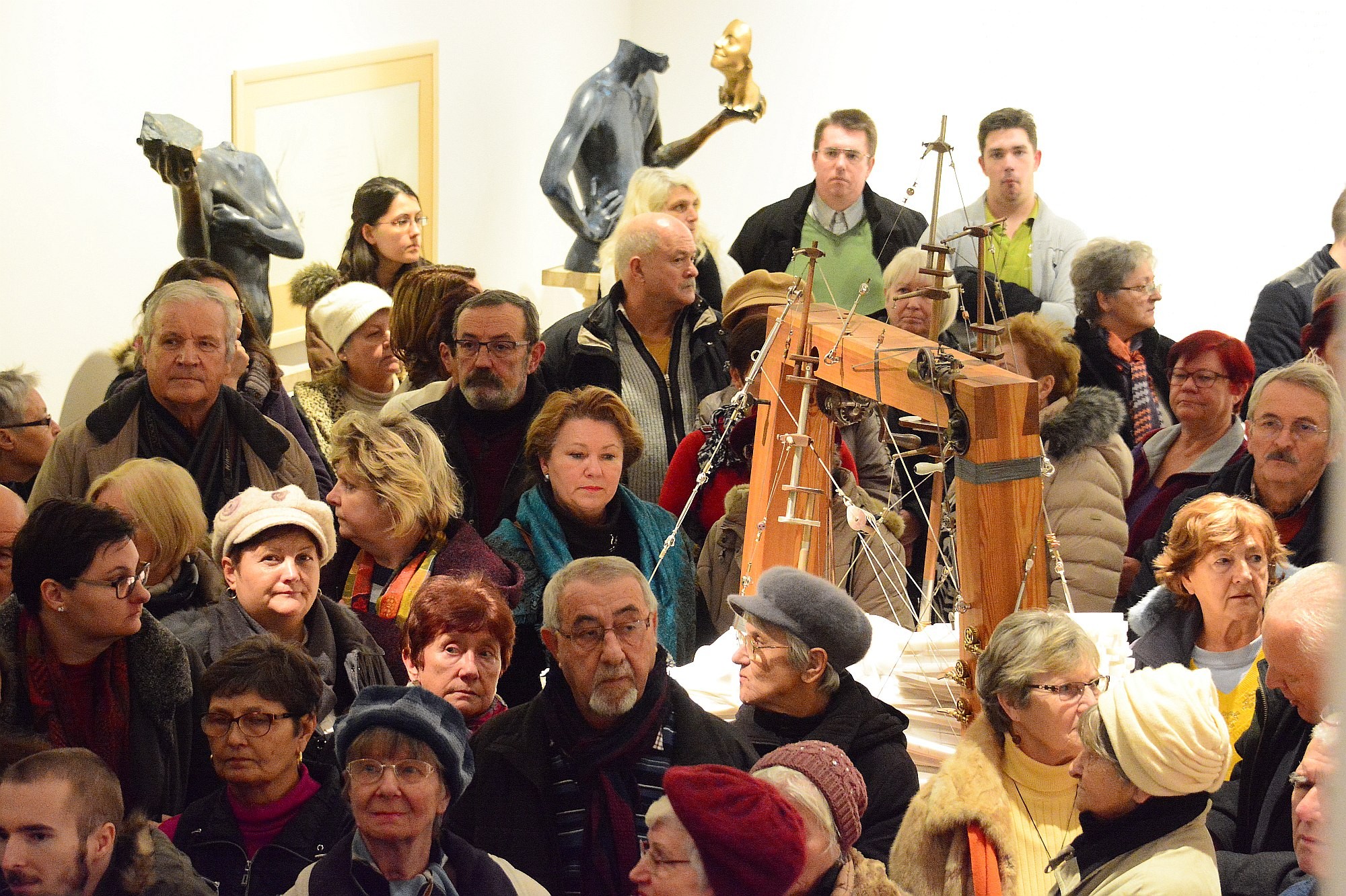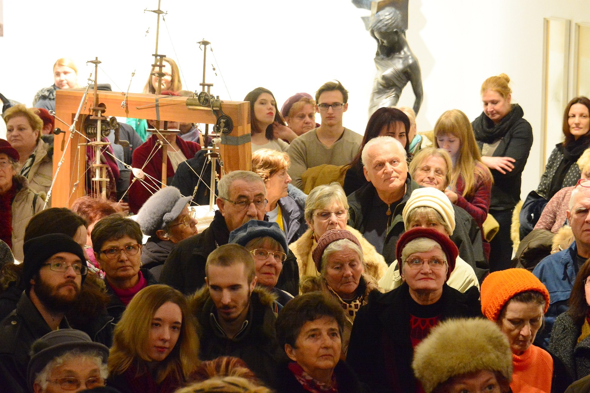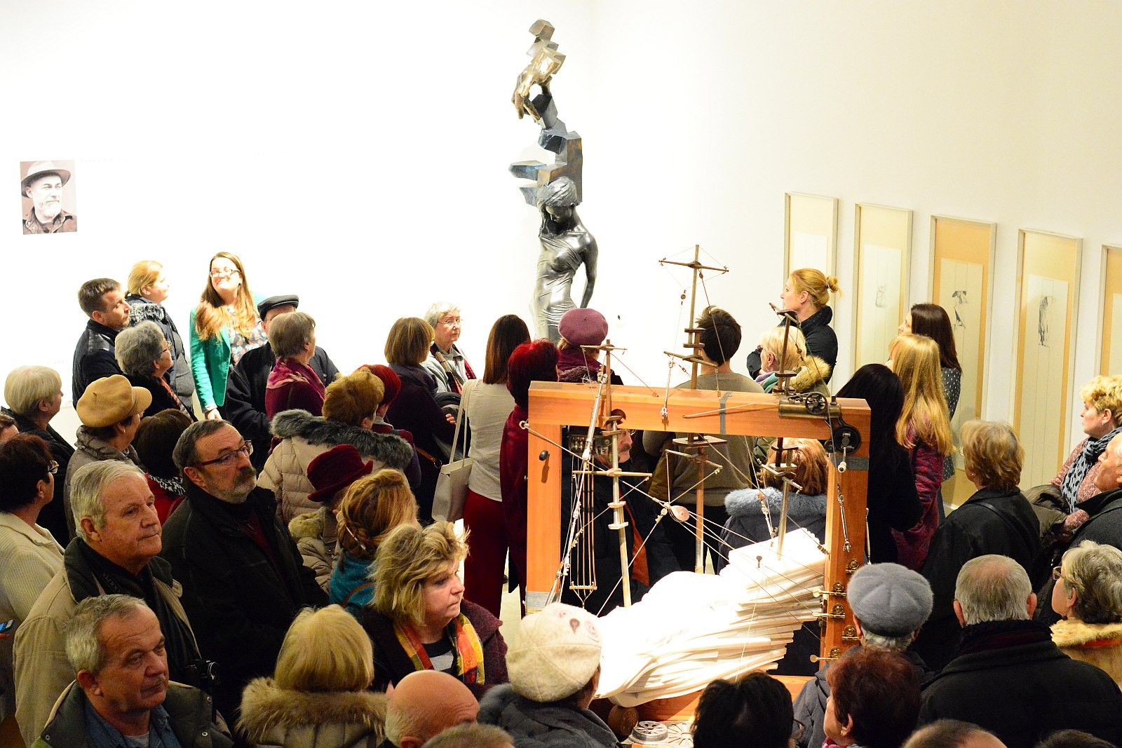 Egy gombostűt sem lehetett volna leejteni, annyian voltak a Csók István Képtárban a HANYATtLÓ - SZÁRNYALÓ című kiállítás tárlatvezetésén, melyet a szobrászművész, Párkányi Raab Péter és Filep Sándor, festőművész tartott közösen.