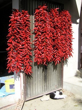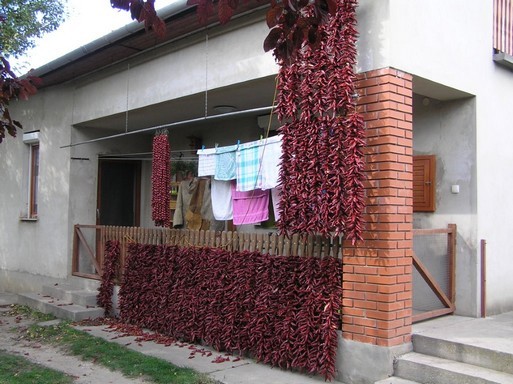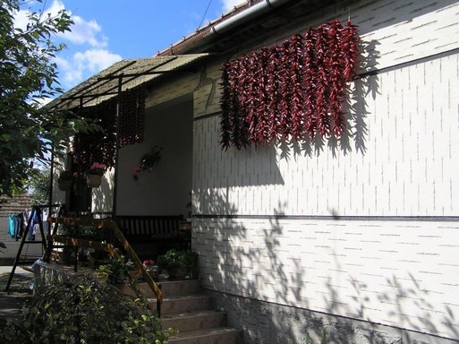 Pazar látvány a Fejér megyei Cecén a rengeteg paprika a házak oldalán. Szüret után a falak mentén csüngenek a gyönyörű füzérek a napfényben.