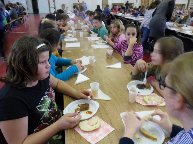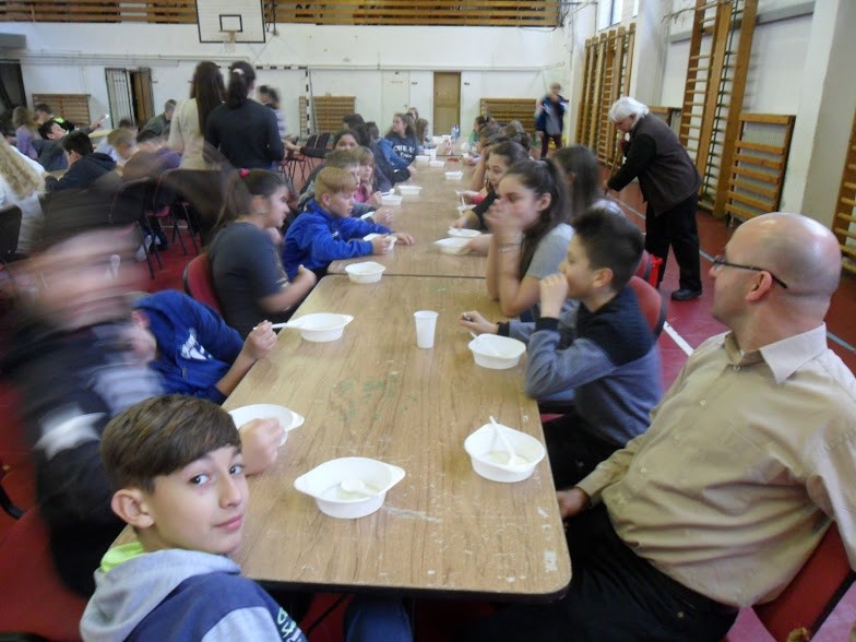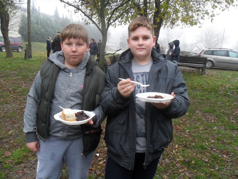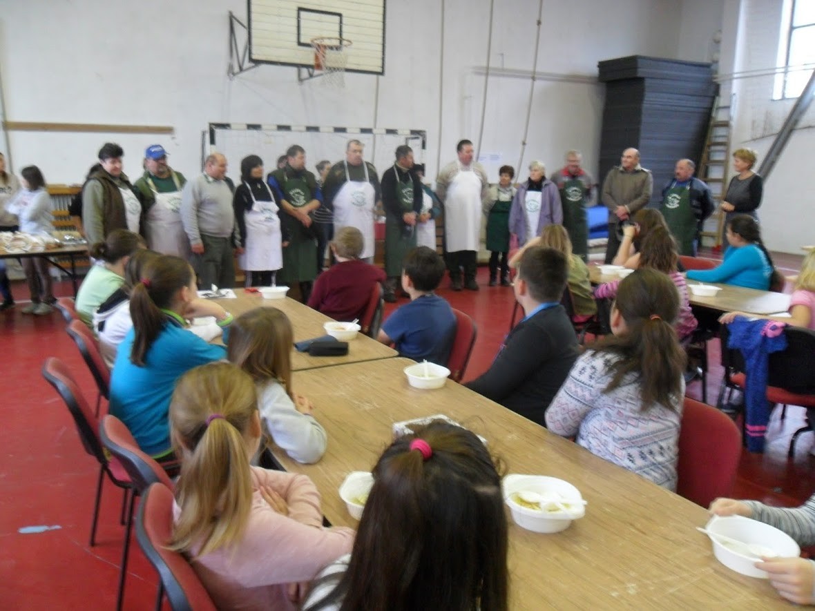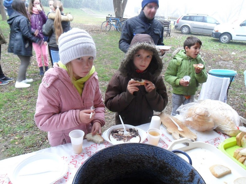 Természetesen nem igazi a disznóvágás, ha a régi, tálán a modern korban már elfeledett ízeket nem ismerhetik meg a gyerekek. A mezőfalvi gazdák alaposan felkészültek. Teljes élelmiszer bemutatót és kóstolót tártak a diákok elé. Reggel a sült vér hagymával, füstölt kolbászos szendvicsek, majd később a pecsenye, hurka, kolbász és az elmaradhatatlan toros húsleves töltötte meg a gyereksereg hasát. Ezen a napon senki sem ment haza korgó gyomorral. Ráadásul olyan élményekkel gyarapodtak, ami egyre kevésbé általános a mai világunkban.