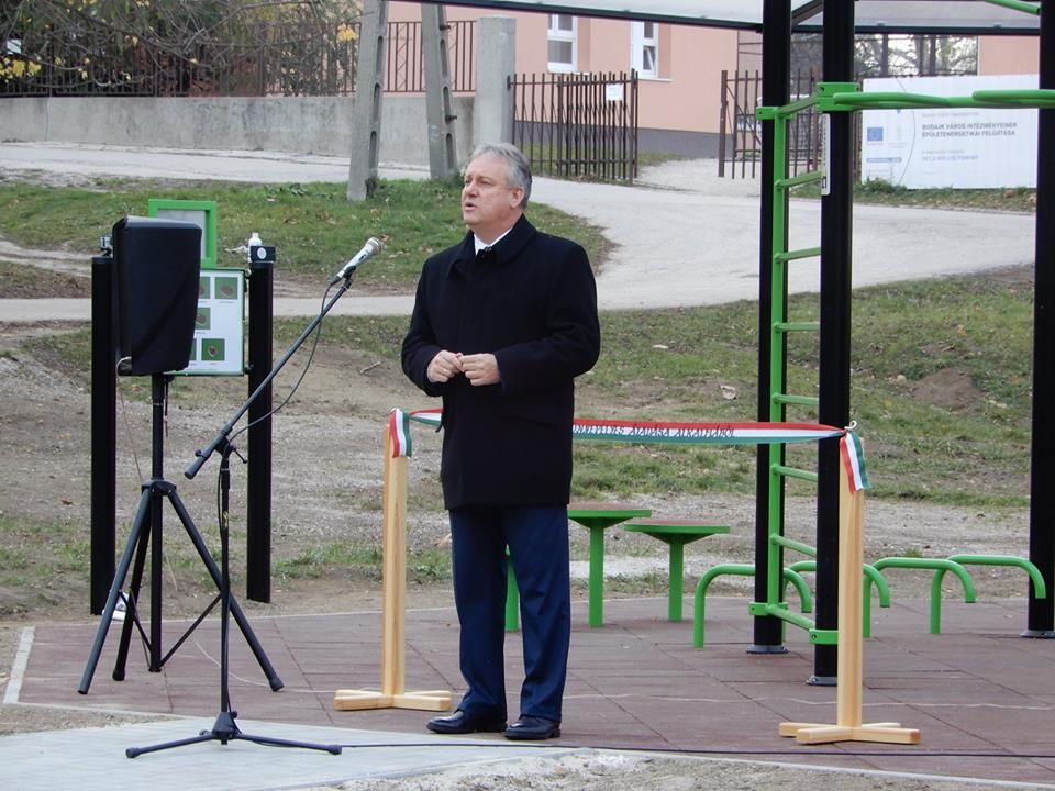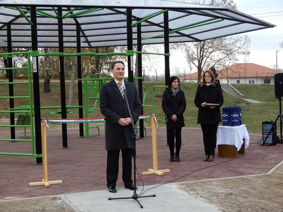 A sportpark ünnepélyes átadásán Dr. Simon László kormánymegbízottal és Wilmek Tiborral a megyei közgyűlés alelnökével közösen vágtuk át a nemzeti színű szalagot.