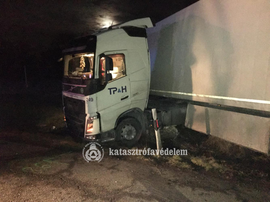 A vízelvezető árokba sodródott, és bebicskázva állt meg egy nyerges vontató február 7-én hajnalban az M7-es autópályán, Székesfehérvárnál.