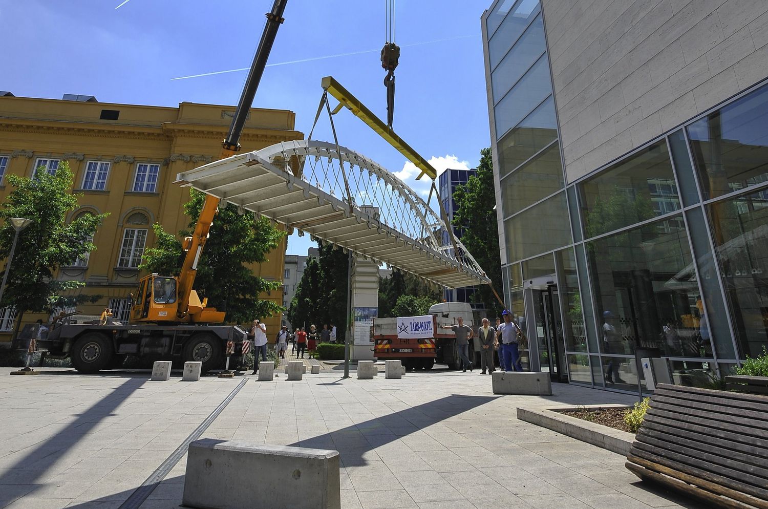 Daruval emelték a dunaújvárosi Pentele híd makettjét a debreceni Modem Modern és Kortárs Művészeti Központ bejárata elé május 23-án.