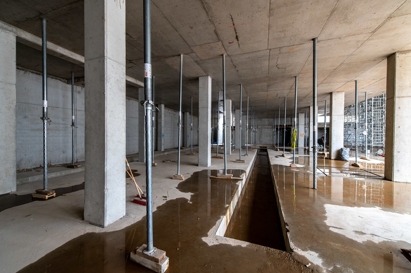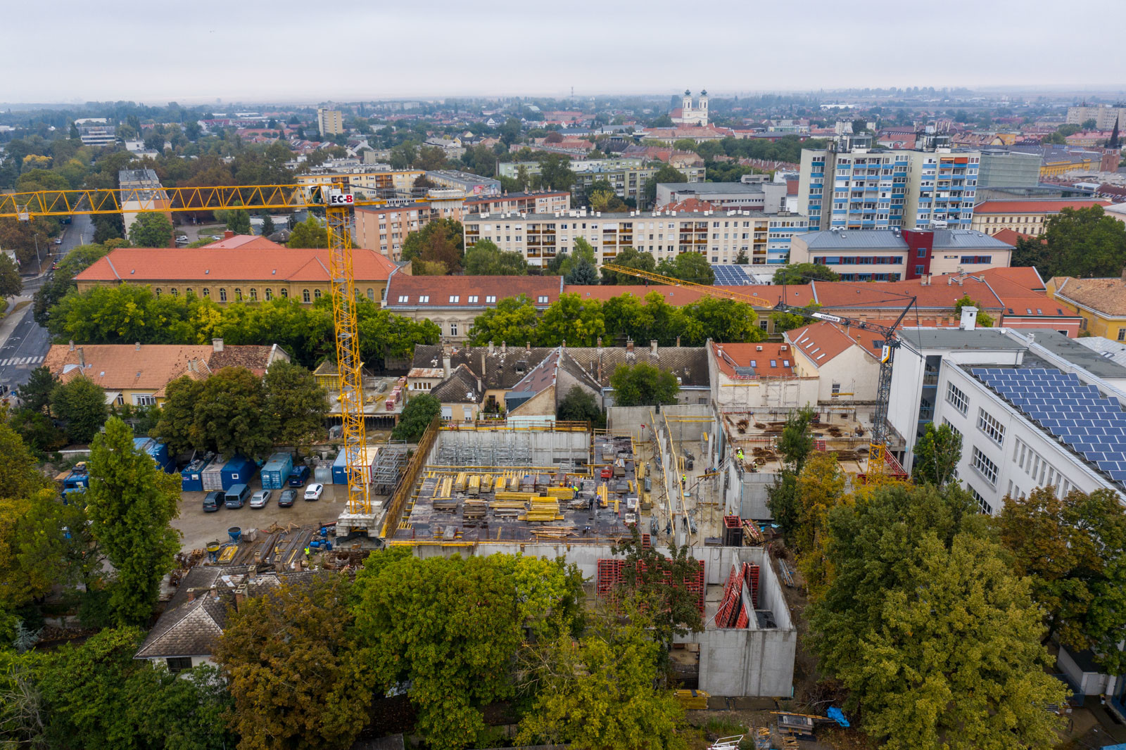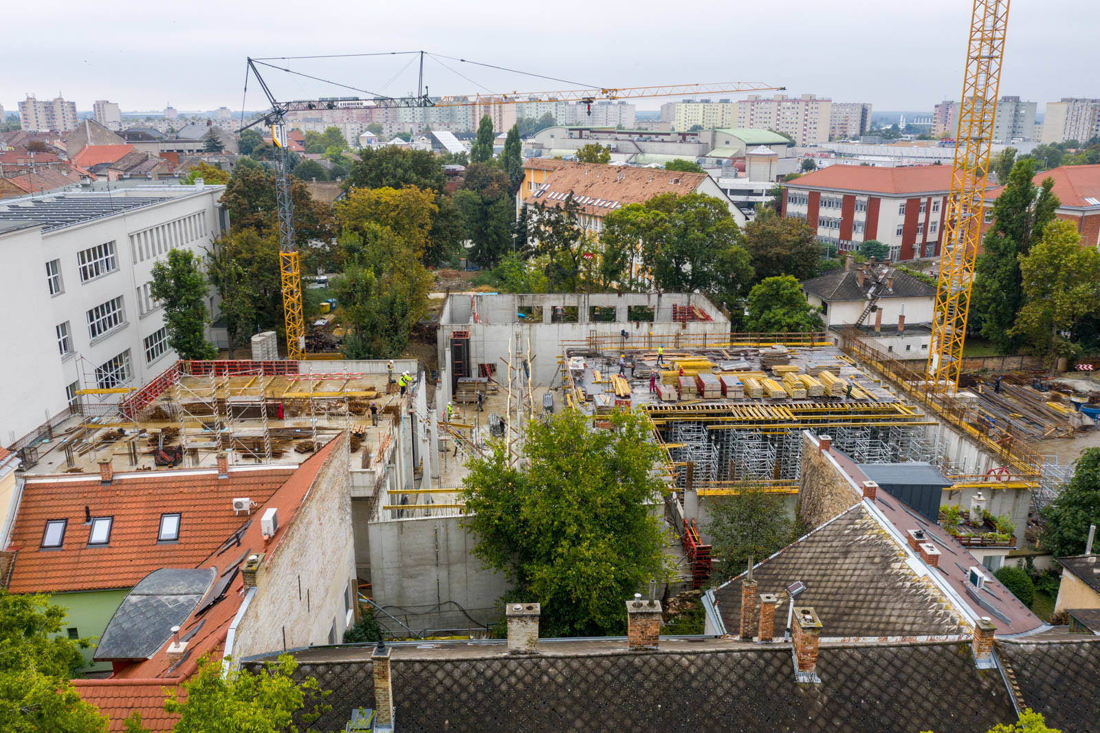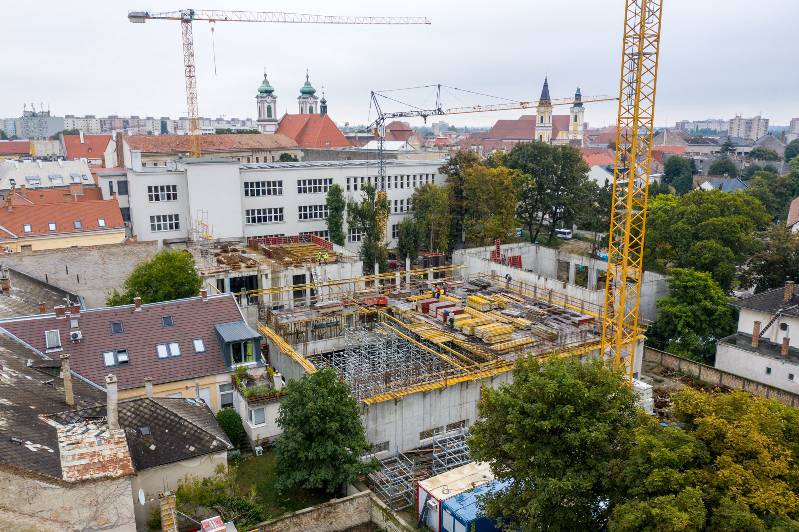 A projektben szerkezetépítőként résztvevő CLC-Construct áprilisban lépett be a munkálatokba az átépülő korábbi tornaterem szerelőbetonozásával. „Ezt követően elkészültek a talpgerendák, illetve a vasalt aljzat, majd folytattuk a munkálatokat a falak, pillérek vasszerelésével, zsaluzásával és betonozásával” – árulta el lapunknak Barabás Sámuel projektvezető. Hozzátette, a tornaterem falainak különlegessége abban rejlik, hogy azok 6,45 m magasak: „Így jelentős kihívást jelentett számunkra a falak egy ütemben való zsaluzása és betonozása” – mutatott rá a CLC-Construct szakembere.