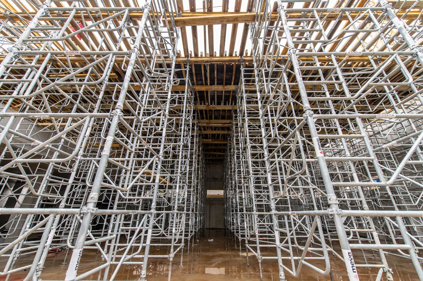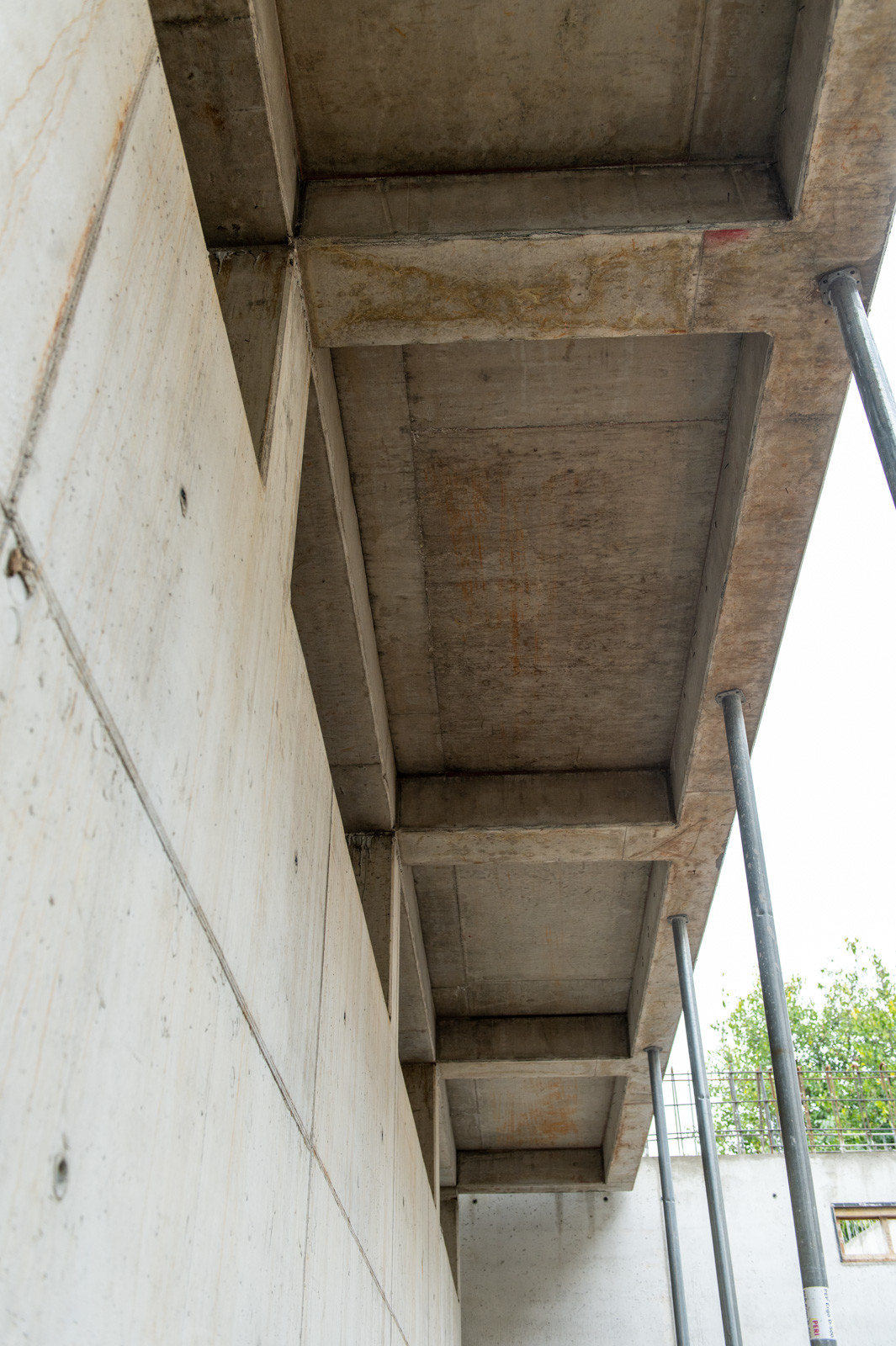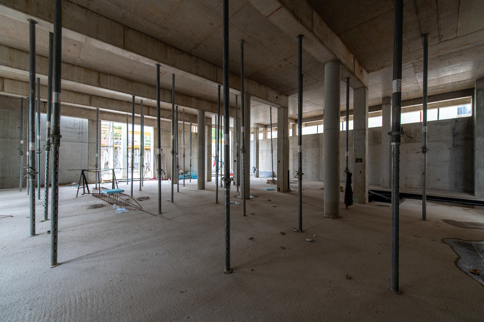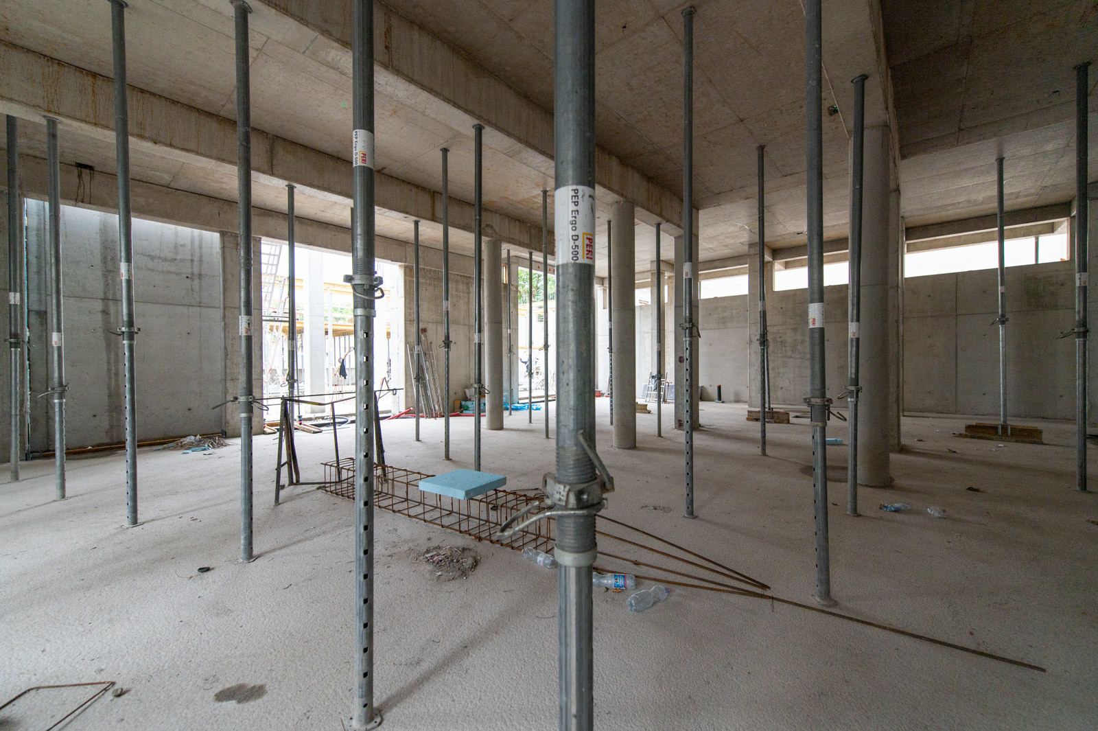 A szakember a jelenlegi munkákra is kitért: „A tornacsarnok zárófödém alatti gerendarács fogadószintjén dolgozunk, melyet MT60-as MEVA-tornyokból építünk 8 méter magasan. Emellett folynak a fogadószint zsaluzási munkái is.” Barabás Sámuel kiemelte, a gerendarácsok elhelyezése és zsaluzása nagy pontosságot igényel az esztétika és a soron következő szerkezet fogadása miatt.” Hozzátette, a gerendarácsot záró födém kinyúlik az egész tornacsarnok felületére és a szomszédos tornateremre is.