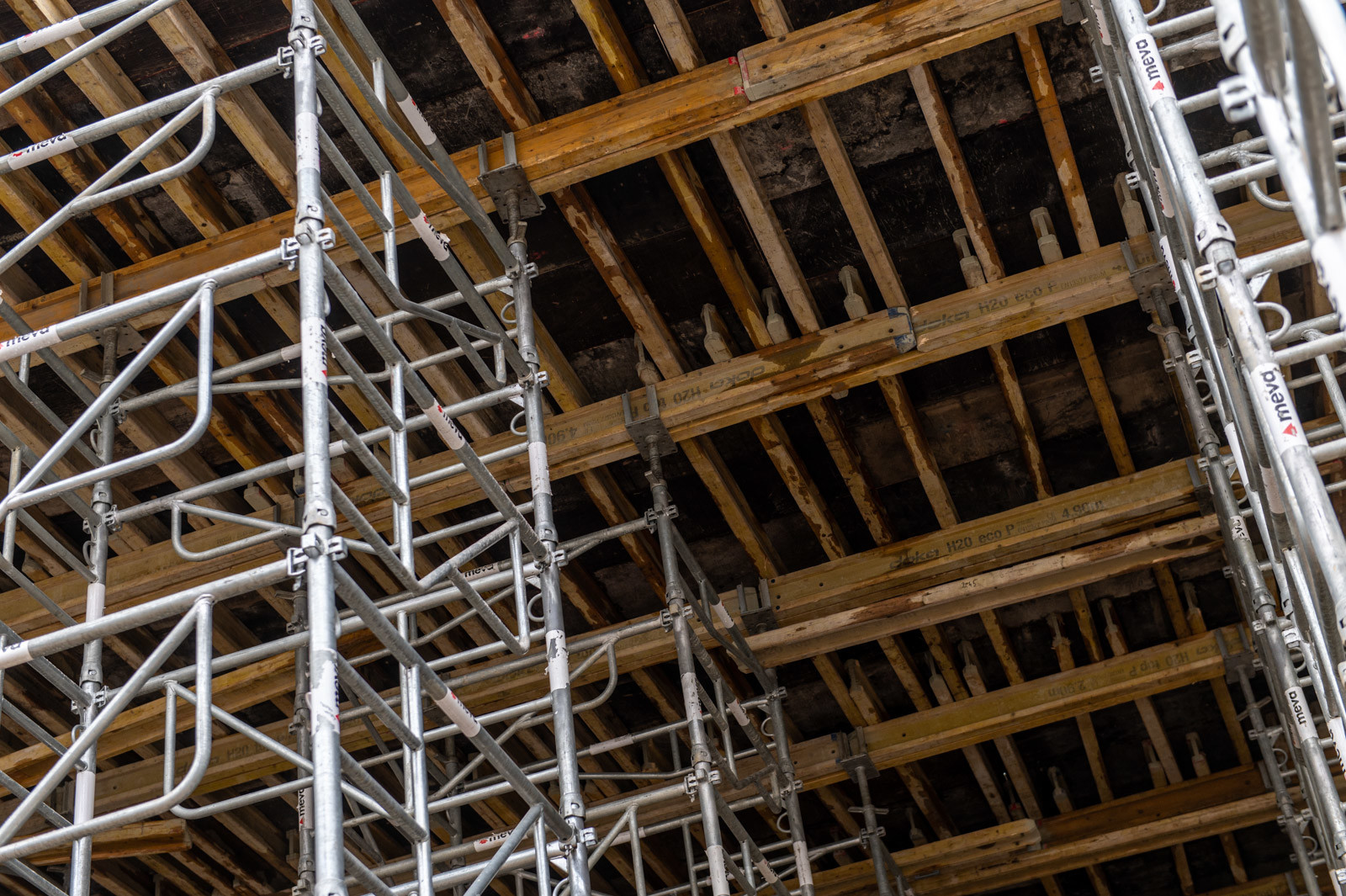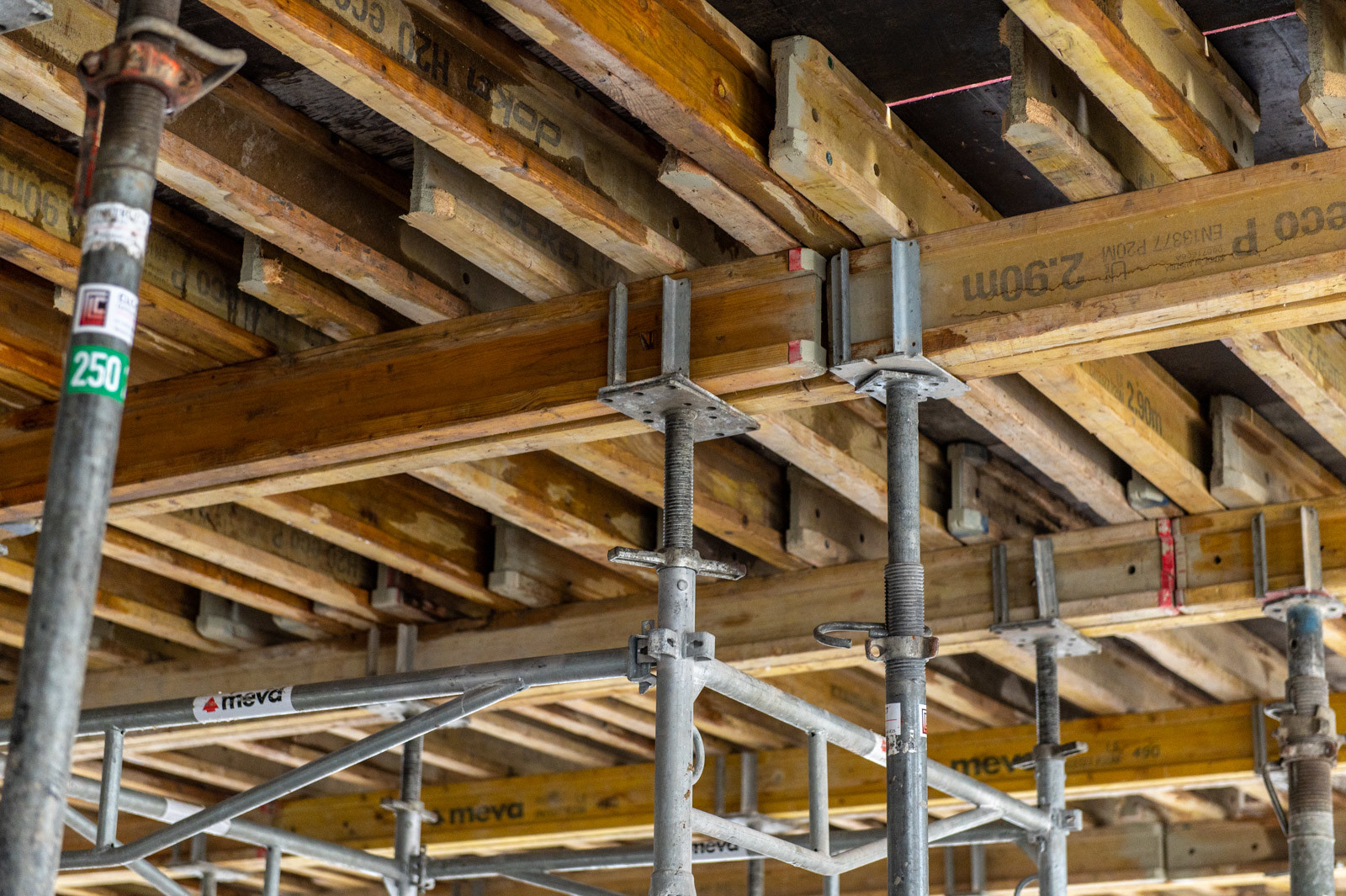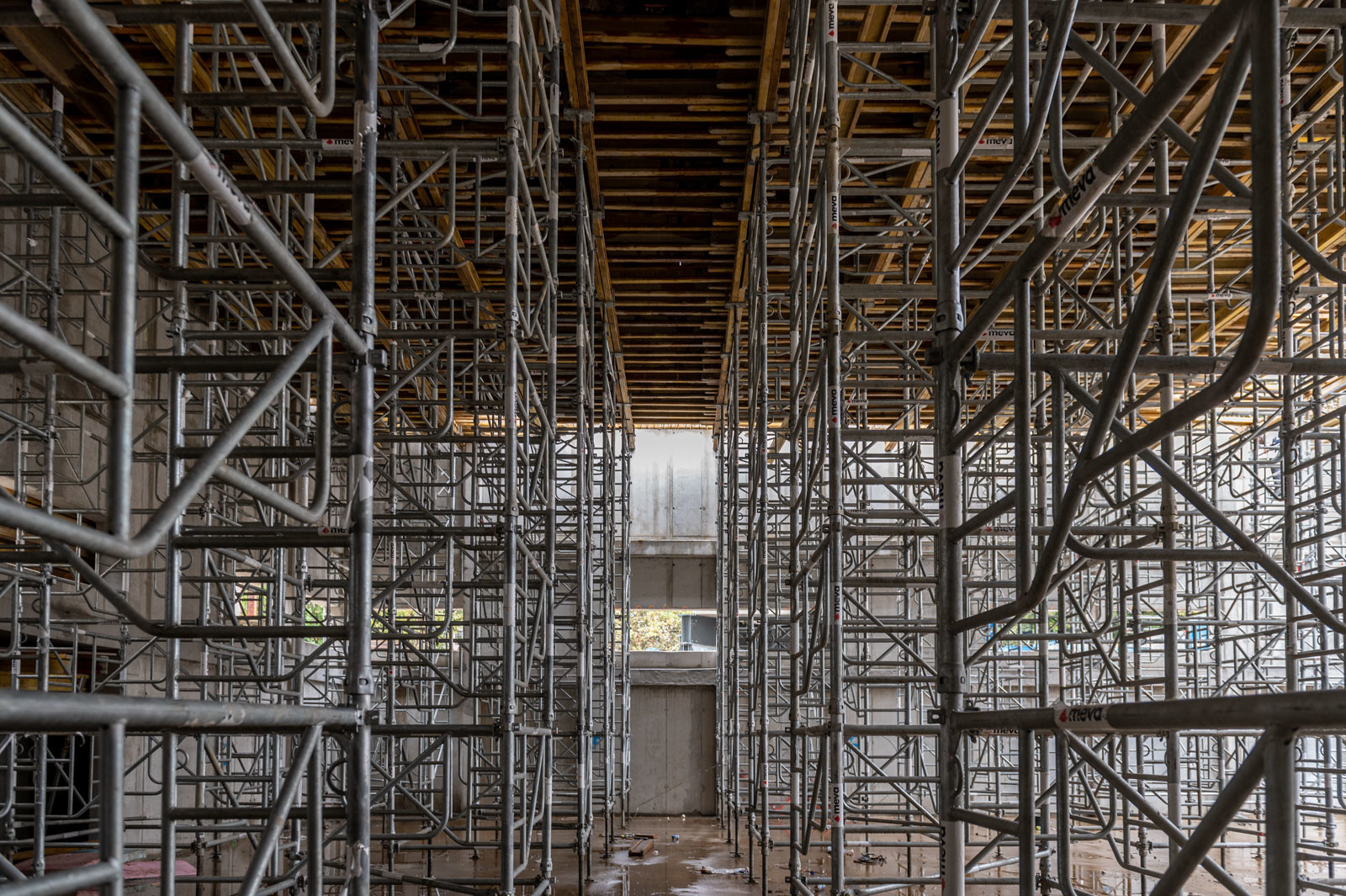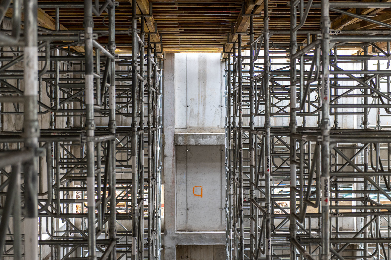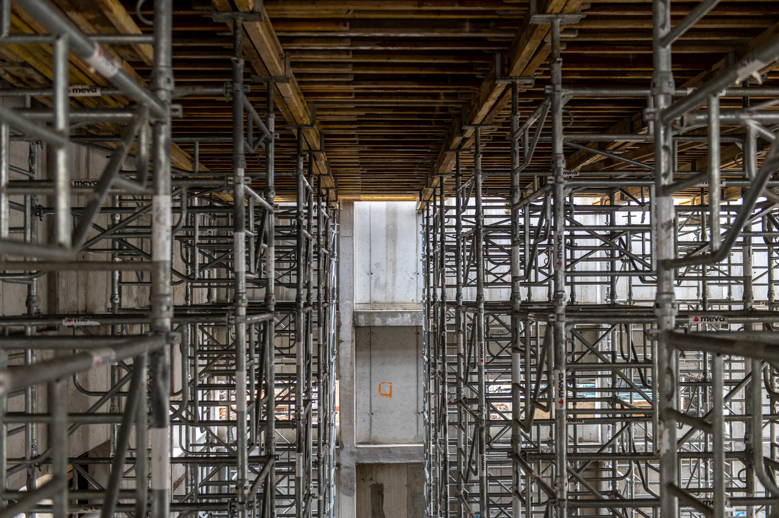 A szakember a jelenlegi munkákra is kitért: „A tornacsarnok zárófödém alatti gerendarács fogadószintjén dolgozunk, melyet MT60-as MEVA-tornyokból építünk 8 méter magasan. Emellett folynak a fogadószint zsaluzási munkái is.” Barabás Sámuel kiemelte, a gerendarácsok elhelyezése és zsaluzása nagy pontosságot igényel az esztétika és a soron következő szerkezet fogadása miatt.” Hozzátette, a gerendarácsot záró födém kinyúlik az egész tornacsarnok felületére és a szomszédos tornateremre is.