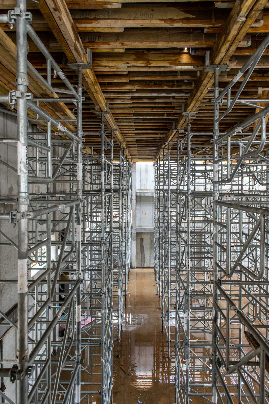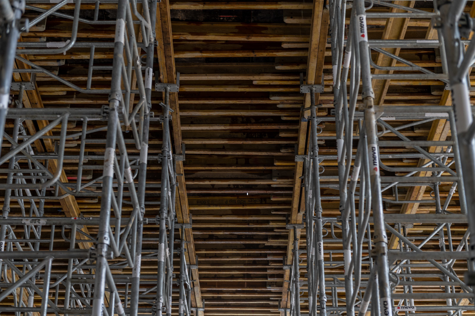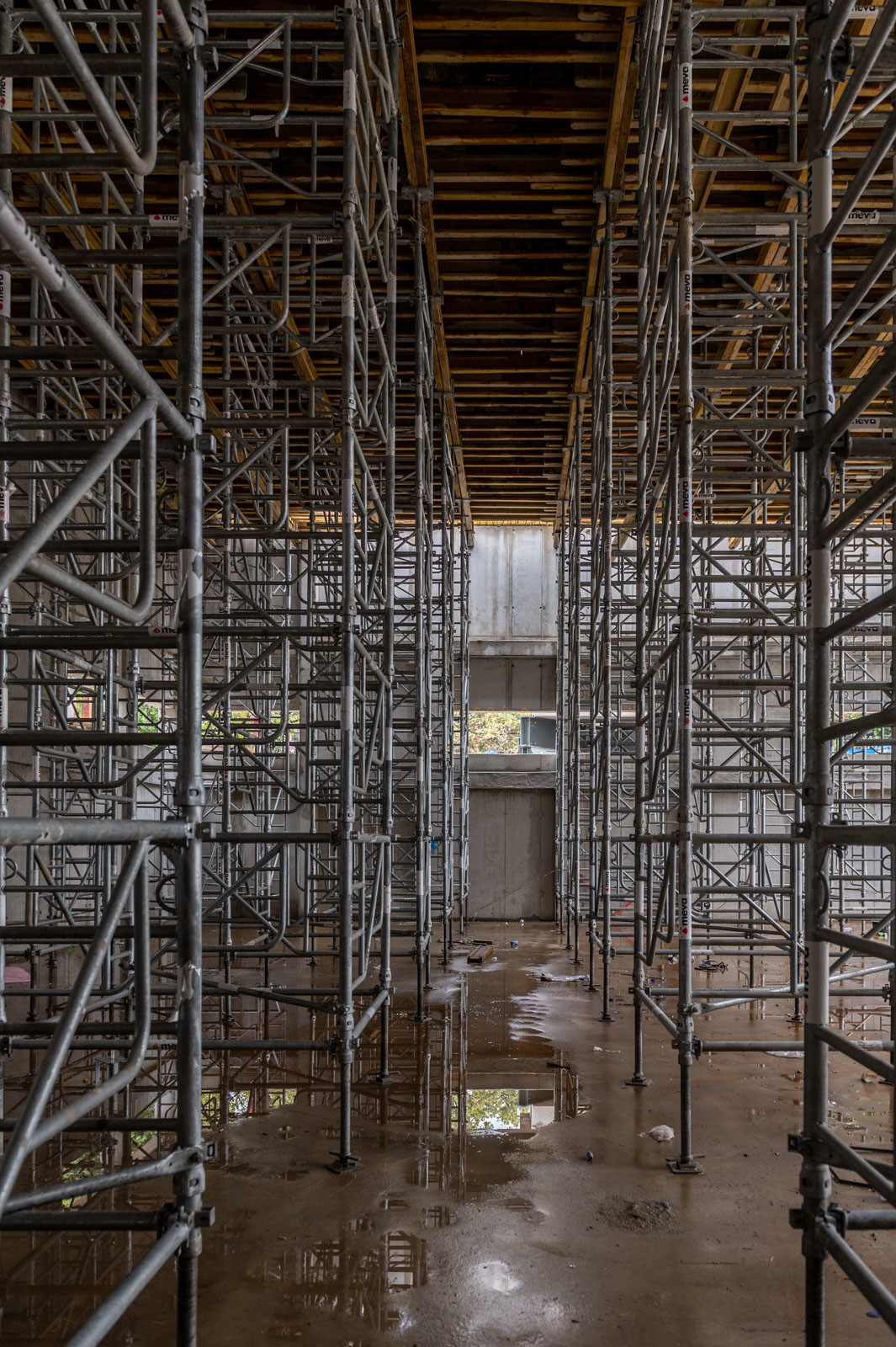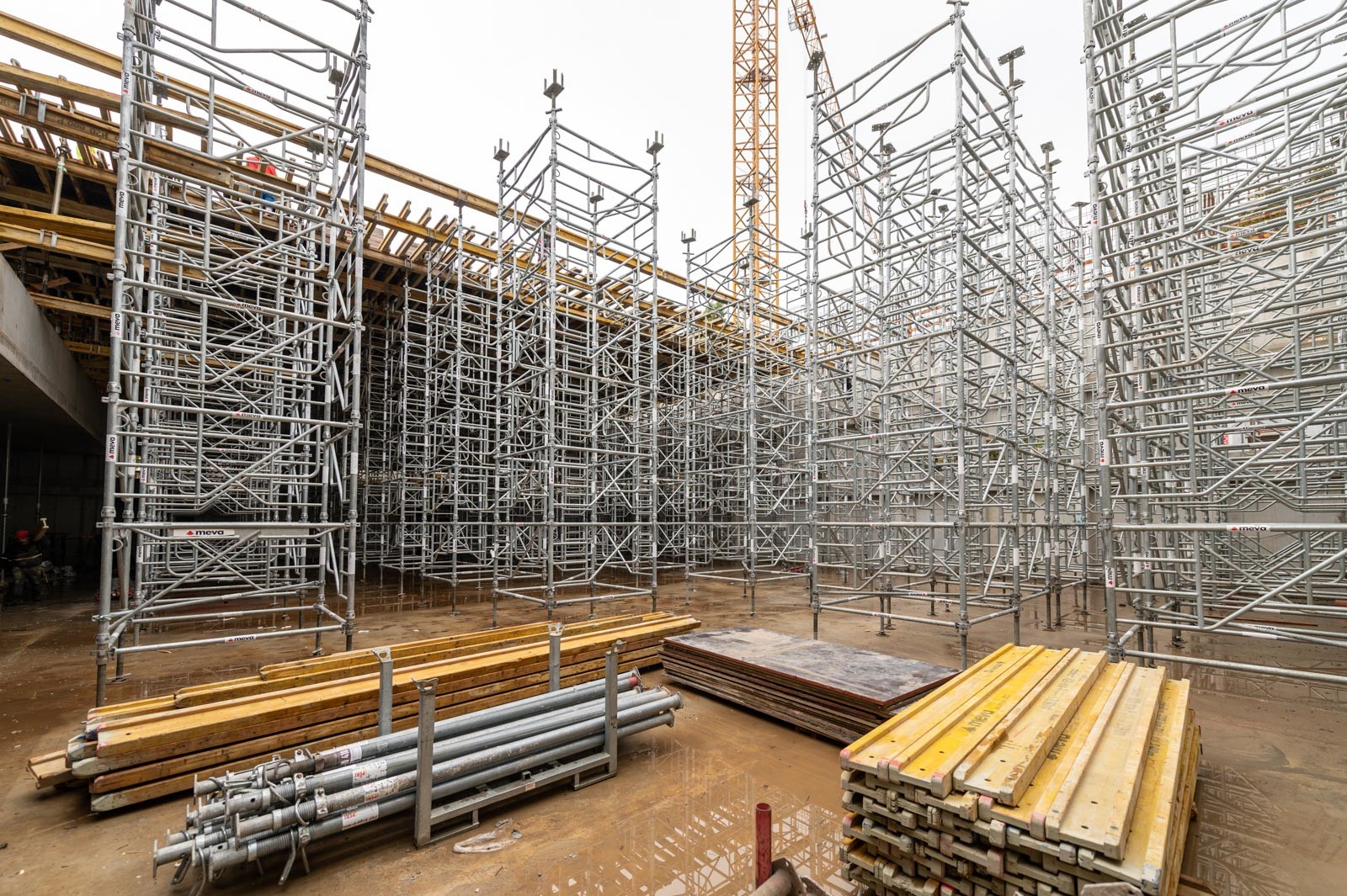 A szakember a jelenlegi munkákra is kitért: „A tornacsarnok zárófödém alatti gerendarács fogadószintjén dolgozunk, melyet MT60-as MEVA-tornyokból építünk 8 méter magasan. Emellett folynak a fogadószint zsaluzási munkái is.” Barabás Sámuel kiemelte, a gerendarácsok elhelyezése és zsaluzása nagy pontosságot igényel az esztétika és a soron következő szerkezet fogadása miatt.” Hozzátette, a gerendarácsot záró födém kinyúlik az egész tornacsarnok felületére és a szomszédos tornateremre is.