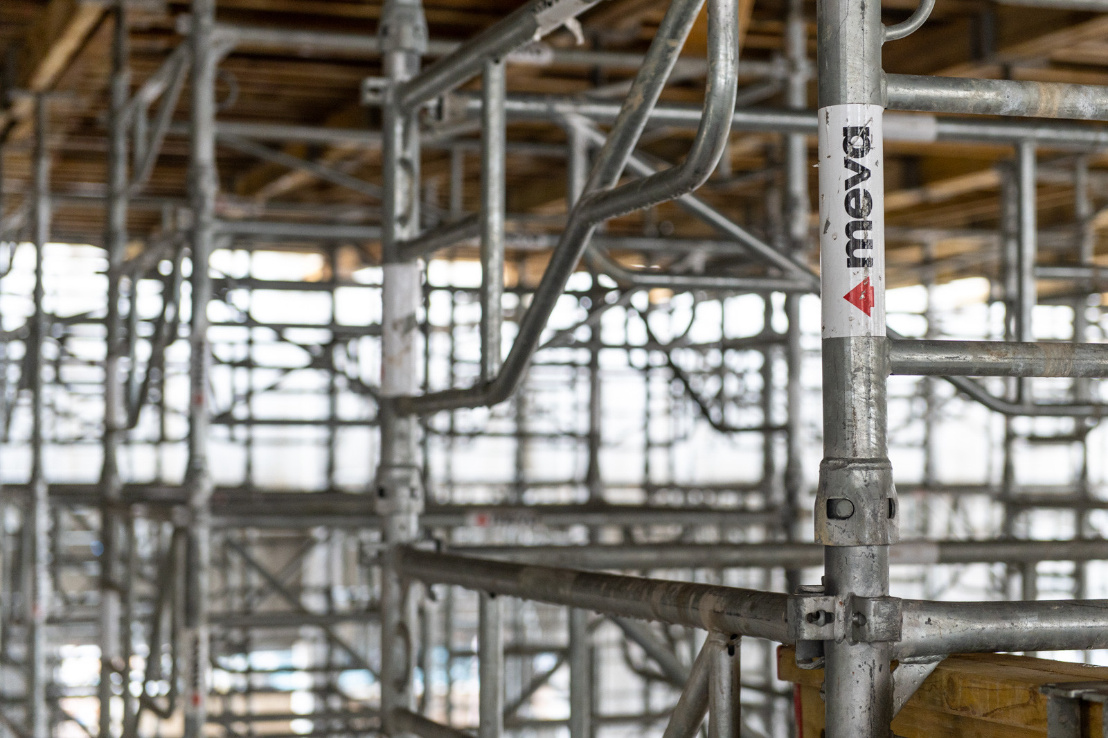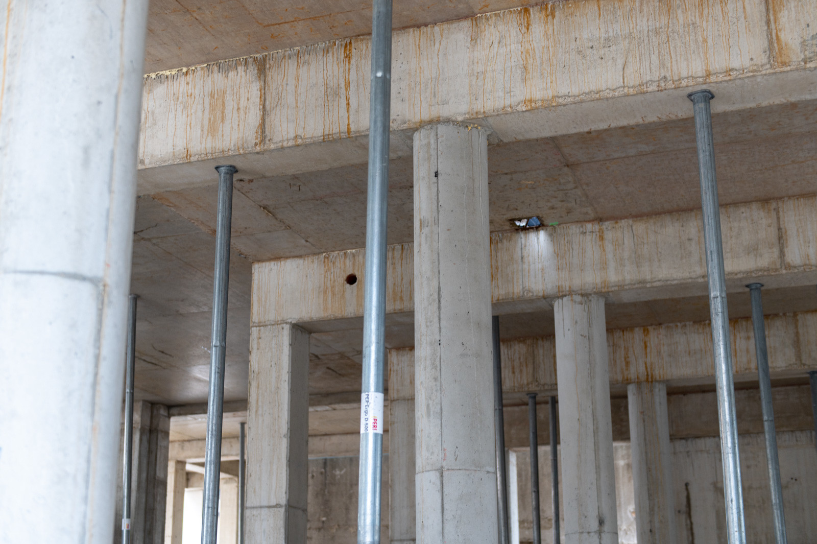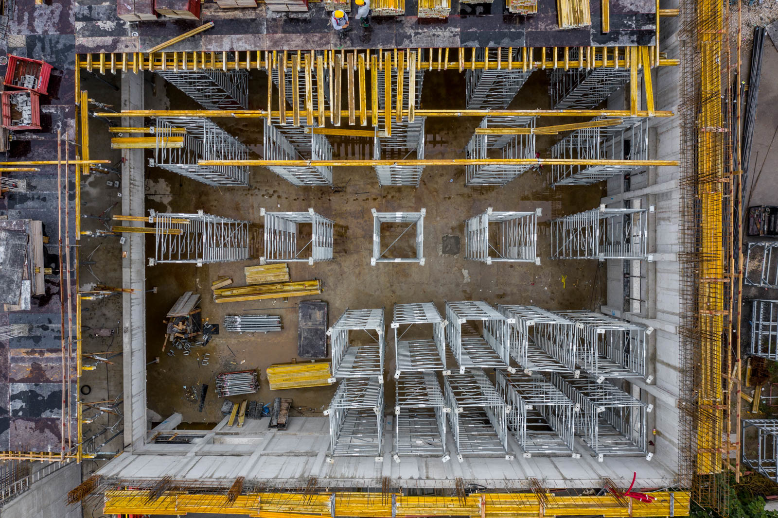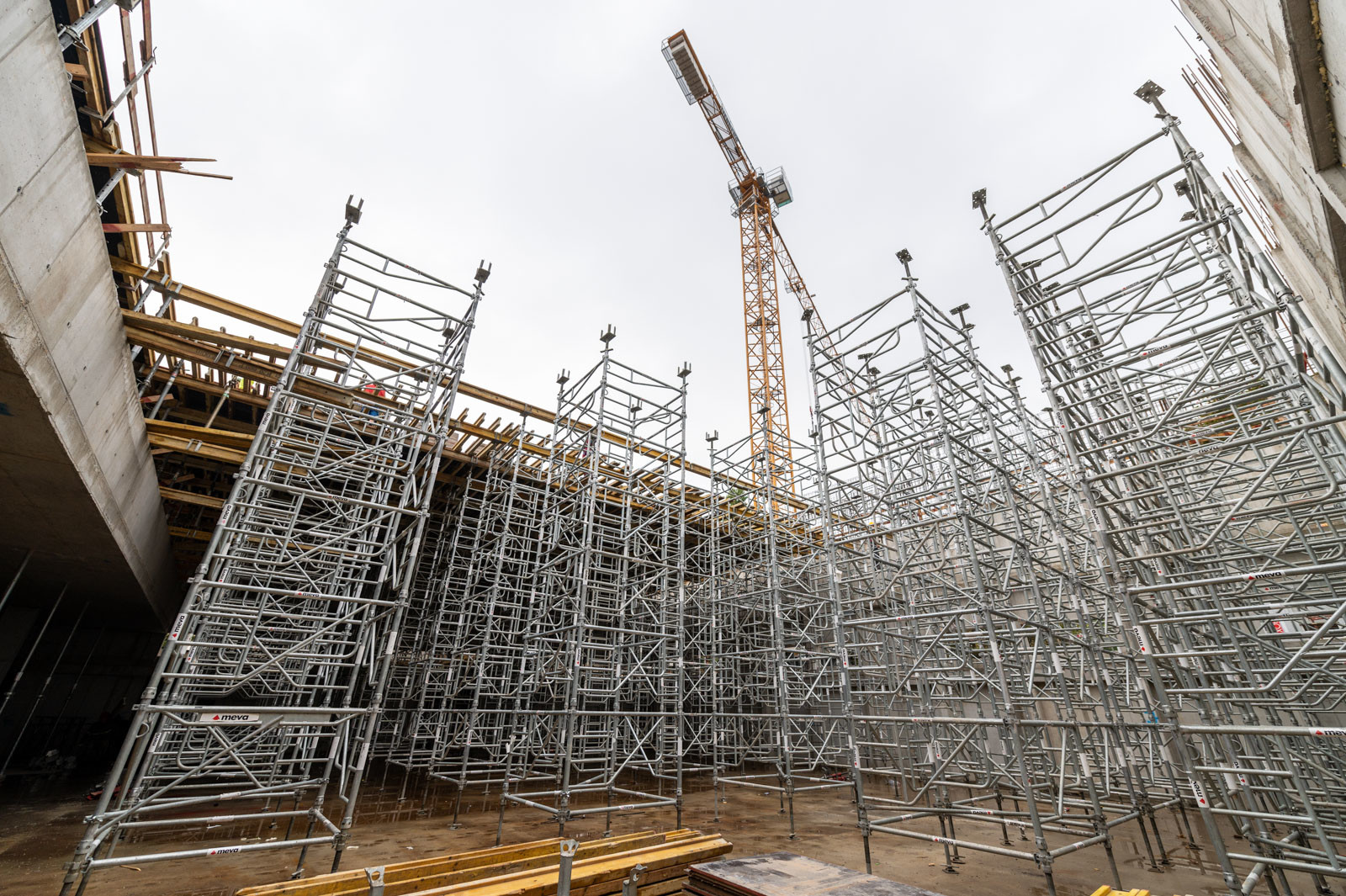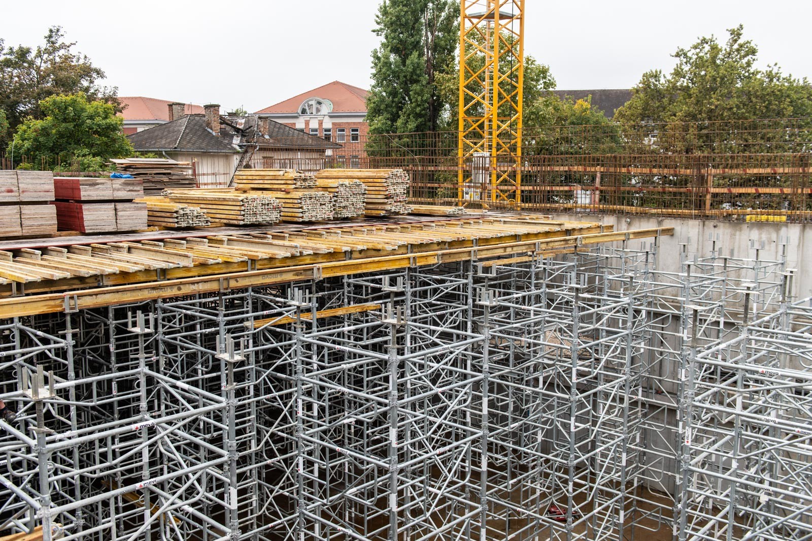 A szakember a jelenlegi munkákra is kitért: „A tornacsarnok zárófödém alatti gerendarács fogadószintjén dolgozunk, melyet MT60-as MEVA-tornyokból építünk 8 méter magasan. Emellett folynak a fogadószint zsaluzási munkái is.” Barabás Sámuel kiemelte, a gerendarácsok elhelyezése és zsaluzása nagy pontosságot igényel az esztétika és a soron következő szerkezet fogadása miatt.” Hozzátette, a gerendarácsot záró födém kinyúlik az egész tornacsarnok felületére és a szomszédos tornateremre is.