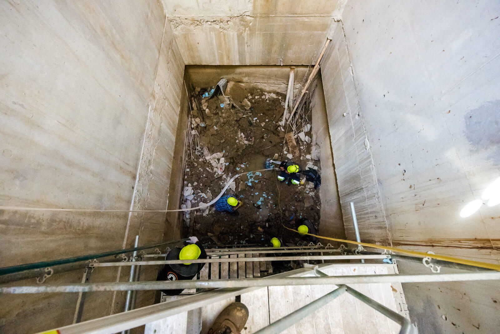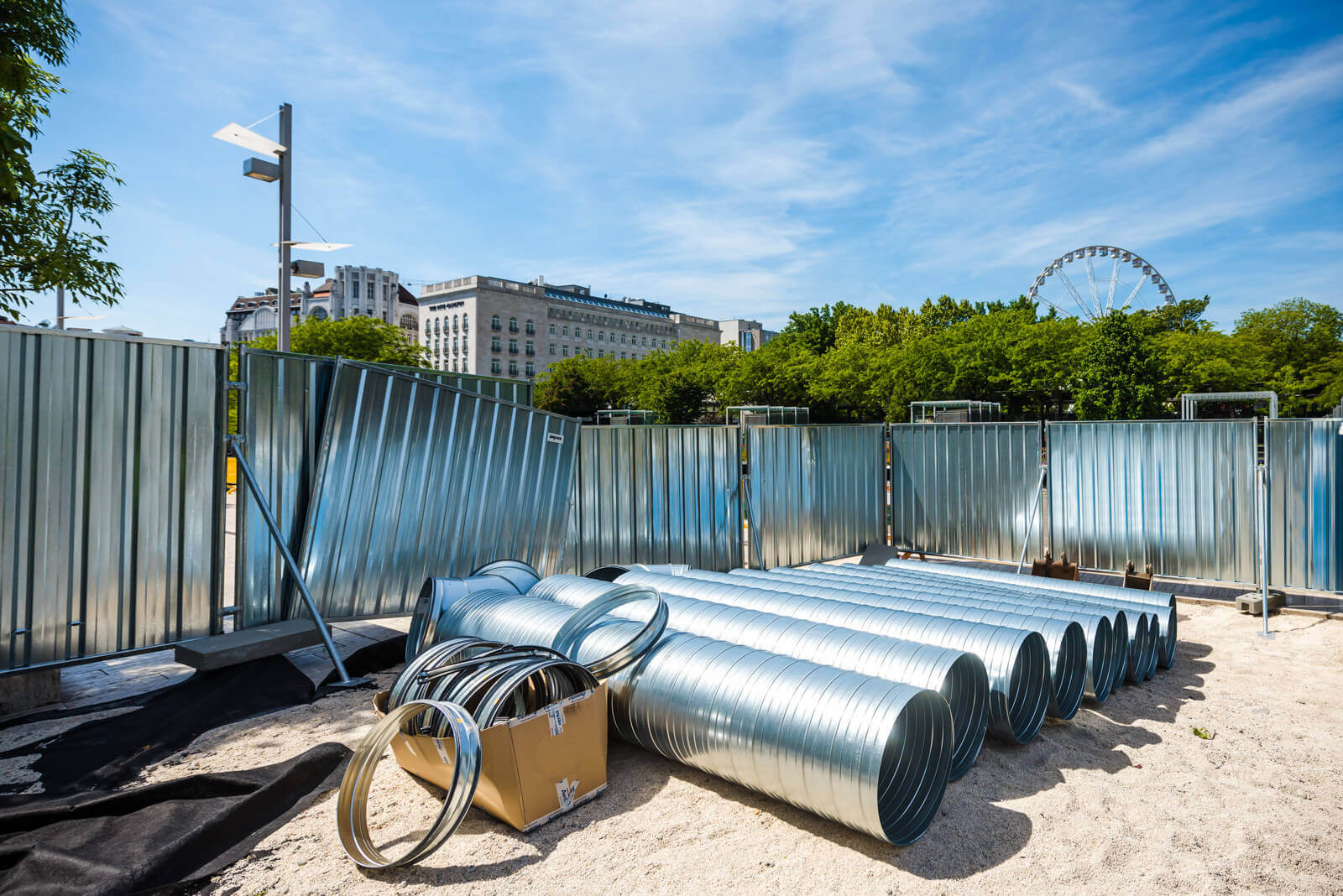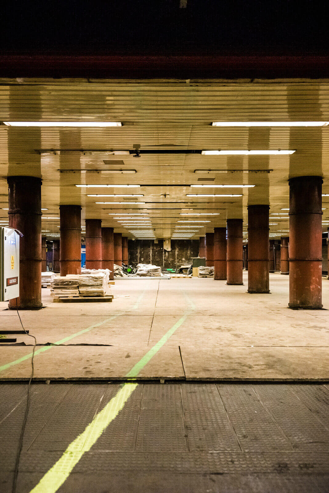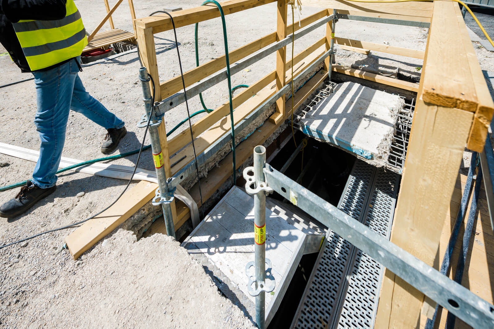 Az elektromos és gépészeti munkák zajlanak, ugyanúgy, mint a kábelazonosítás bonyolult folyamata (erről itt olvashatják cikkünket) és az ideiglenes energiaellátás kiépítése is. Mivel vannak elemek, melyeket az aluljárón és a lépcsőn keresztül visznek ki, ezeket a területek védelemmel látják el.