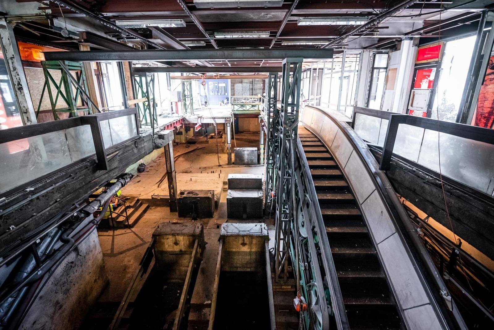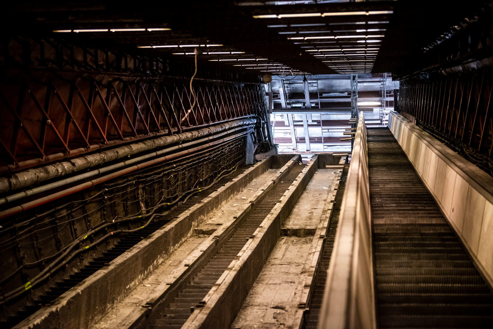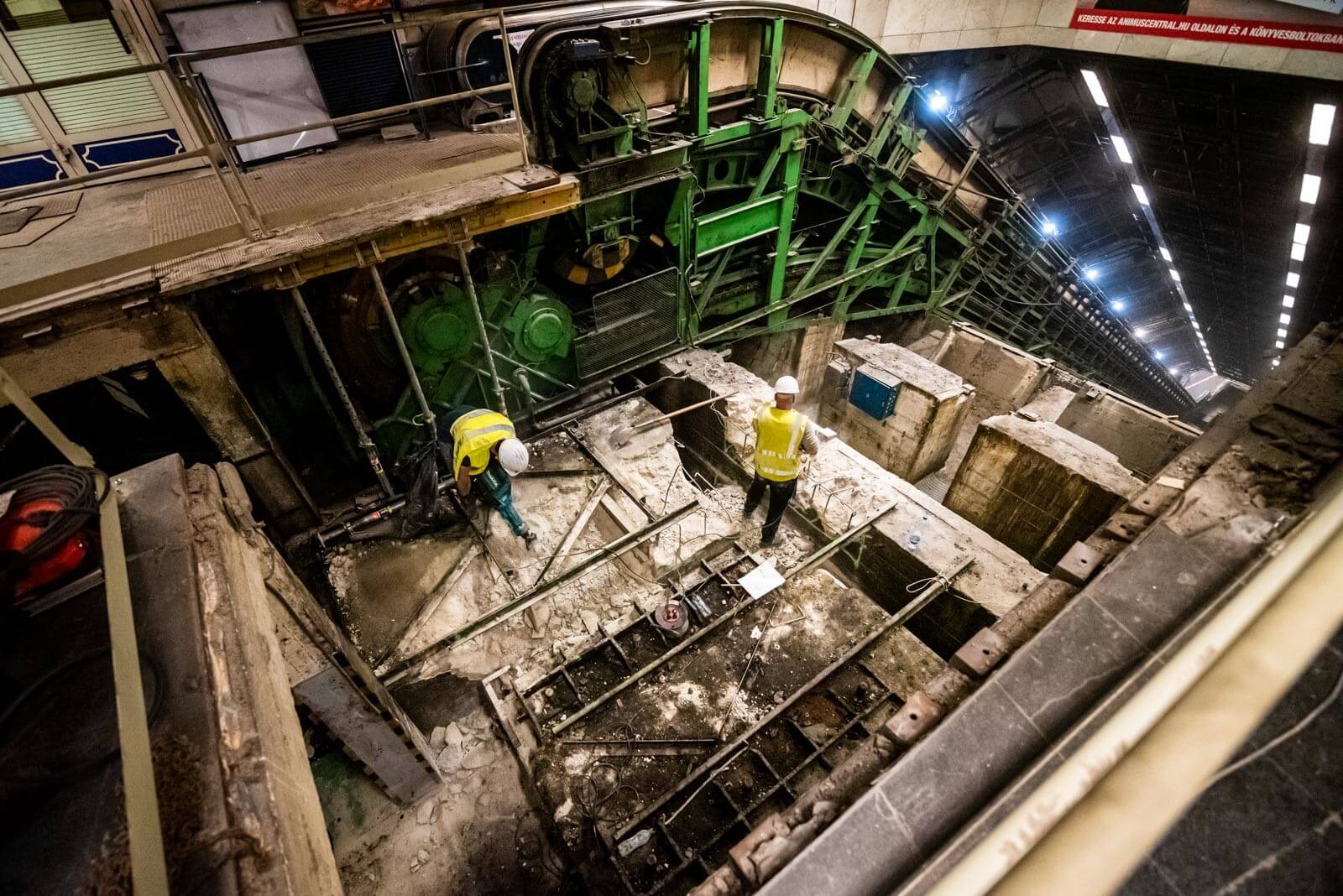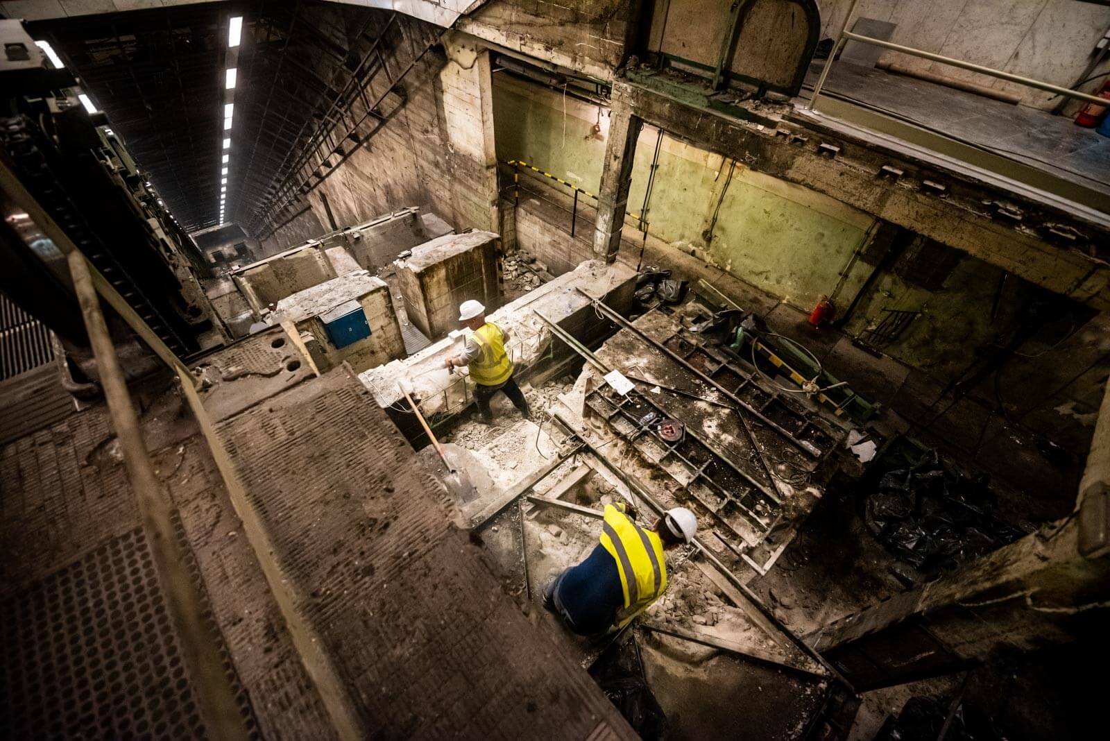 A Ferenciek terén már jóval régebb óta zajlik a felújítás, így teljesen más munkafázisban vannak: itt a bontási munkákat a gépalapokon, a válaszfalakon és a mozgólépcső alaptesteken, illetve gépészeti- és elektromos szerelvényeken végeztek az elmúlt hetekben.