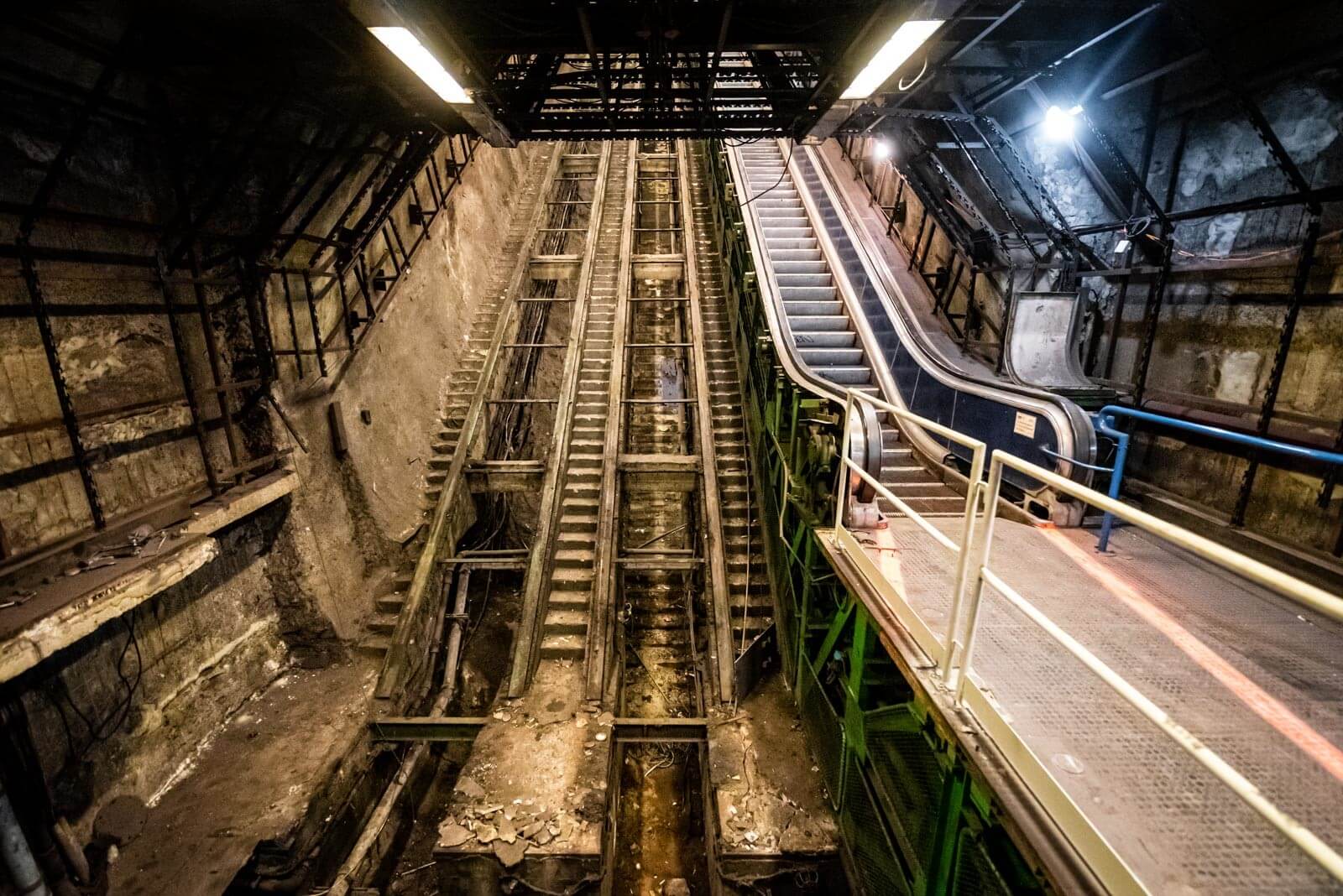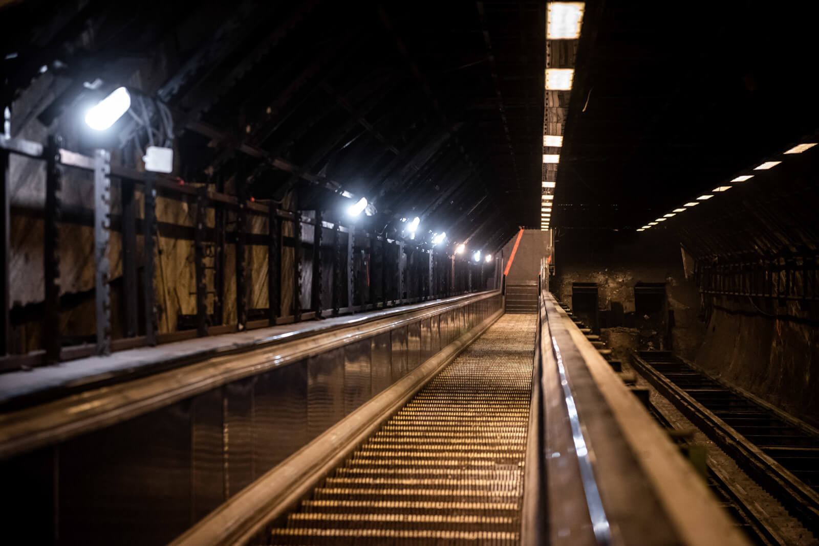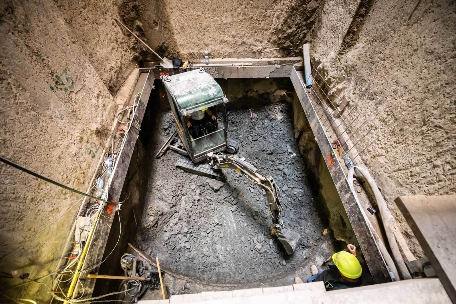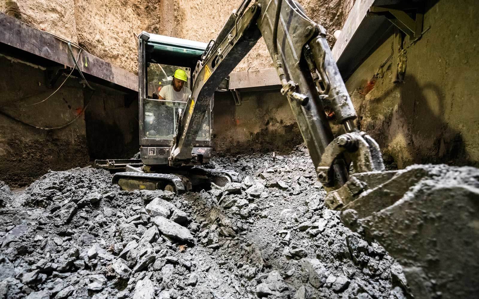 A Ferenciek terén már jóval régebb óta zajlik a felújítás, így teljesen más munkafázisban vannak: itt a bontási munkákat a gépalapokon, a válaszfalakon és a mozgólépcső alaptesteken, illetve gépészeti- és elektromos szerelvényeken végeztek az elmúlt hetekben.
